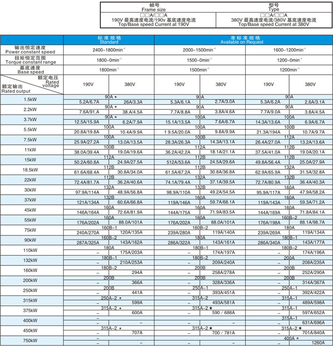 注1) 315kW 375kW 450kW以及750kW中,*標(biāo)記只表示恒轉(zhuǎn)矩控制。但是,如果容A從750kW降低到700kW,則可適用于電機(jī)轉(zhuǎn)速范圍1500~1200min-1。  (700kW 1500/1200 min-1 1101/1170A)